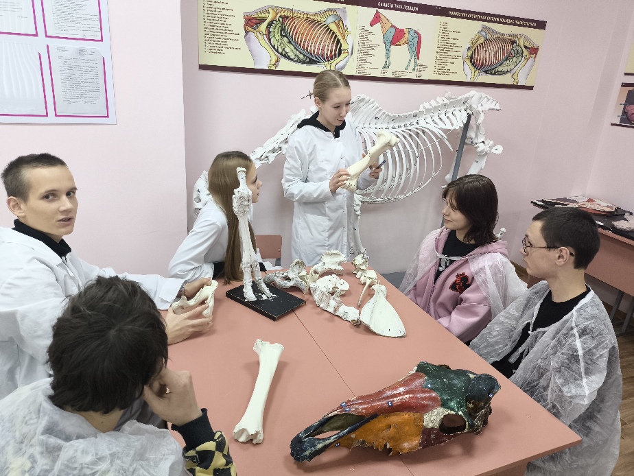 Третий урок был посвящен анатомии и физиологии сельскохозяйственных животных. Преподаватель Фролова О.В. раскрыла тему «Строение и топография костей скелета», что дало учащимся представление о внутреннем строении животных и их физиологических особенностях.