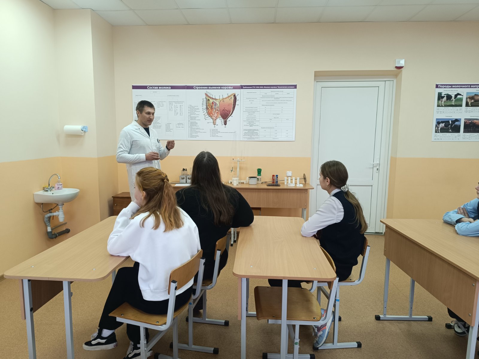 На следующей площадке, посвящённой скотоводству и технологии производства молока и говядины, преподаватель Царикевич М.В. рассказал о свойствах и качестве молока, что также является важной частью производственного процесса. Учащиеся смогли задать вопросы и получить ответы о том, как организовать процесс производства и обеспечить высокое качество продукции.