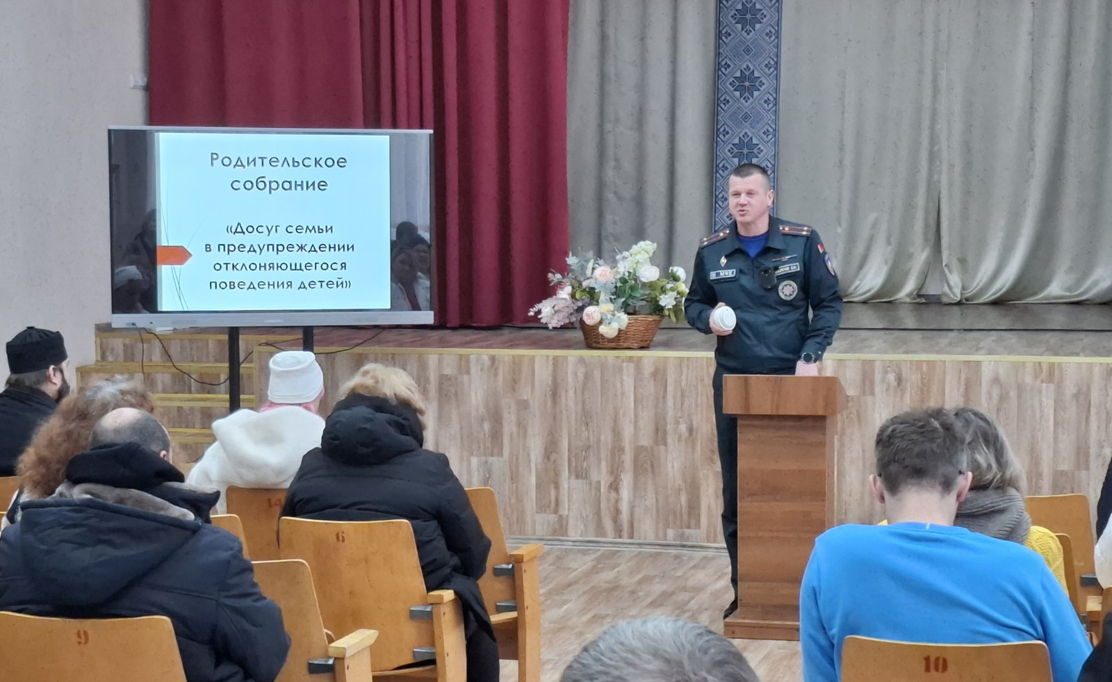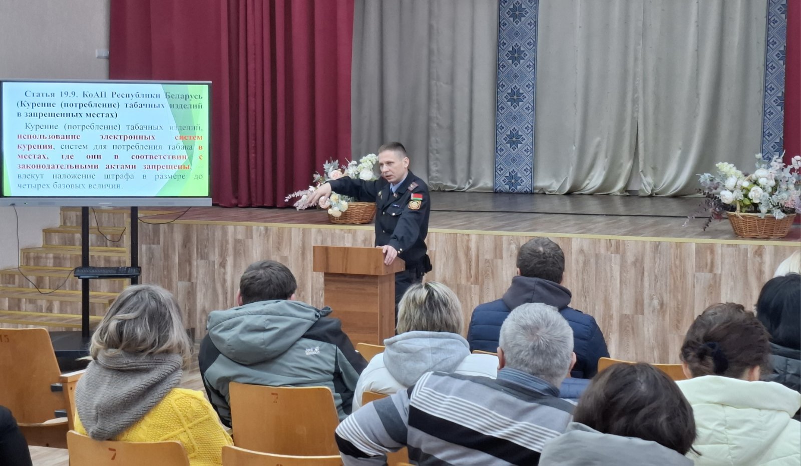 Выступление Евгения Леонидовича Юшкевича, участковый инспектор ИДН Вилейского РОВД, было посвящено правилам безопасного и ответственного поведения. Евгений Леонидович раскрыл вопросы недопустимости противоправного поведения при использовании банковских платежных карт, о половой неприкосновенности несовершеннолетних, об ответственности за хранение, употребление и распространение наркотических средств, о правилах поведения в социальных сетях и мессенджерах.