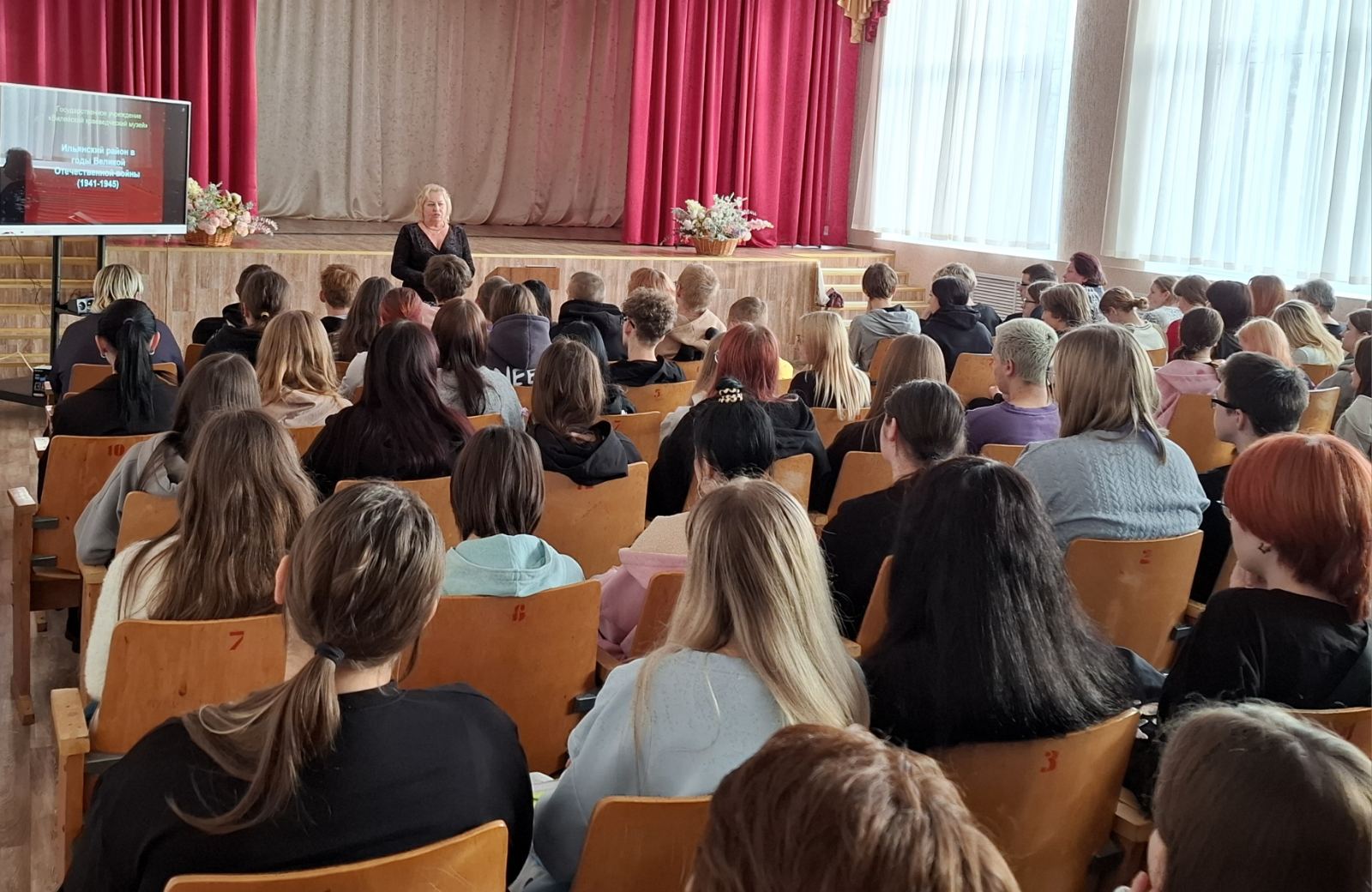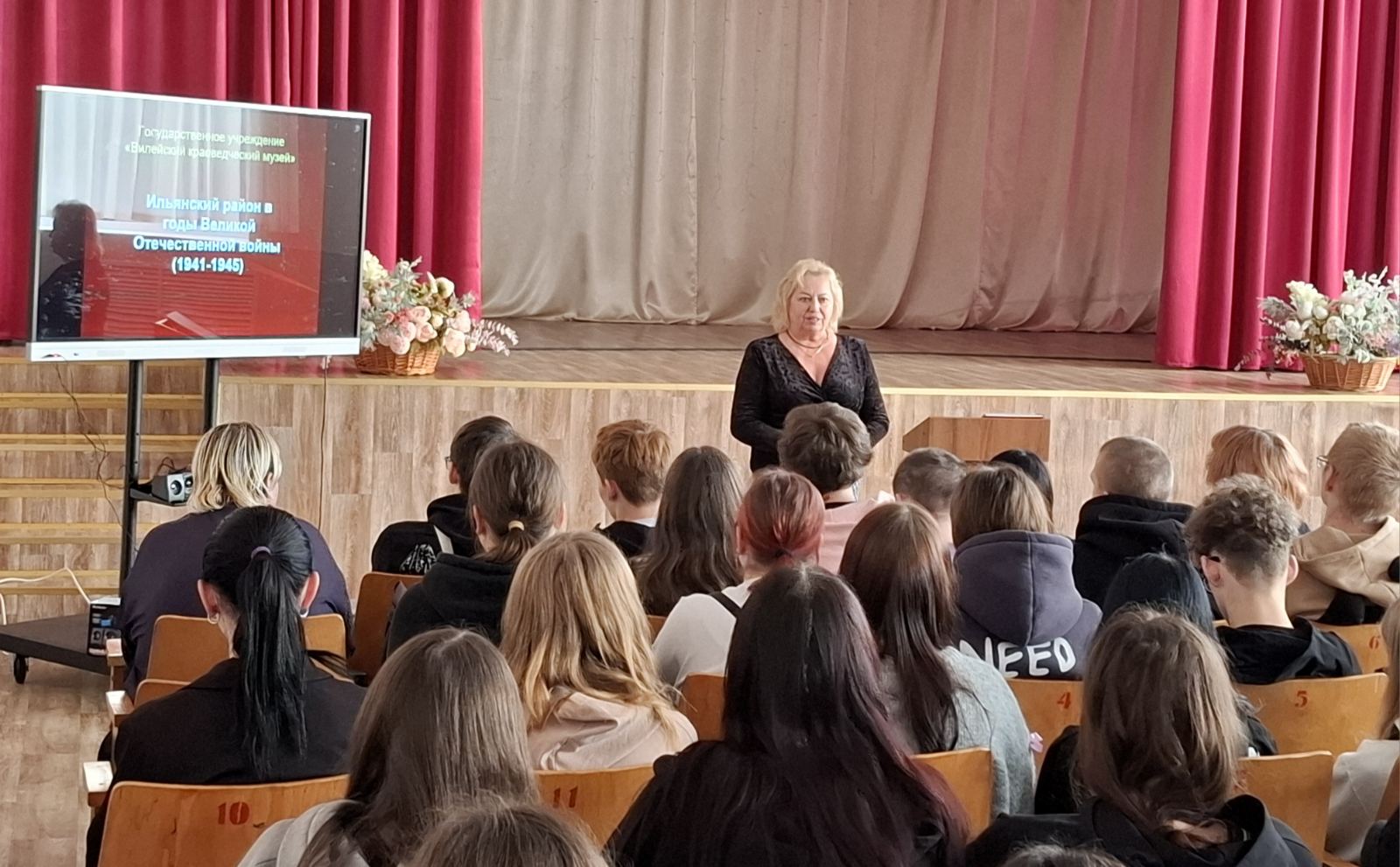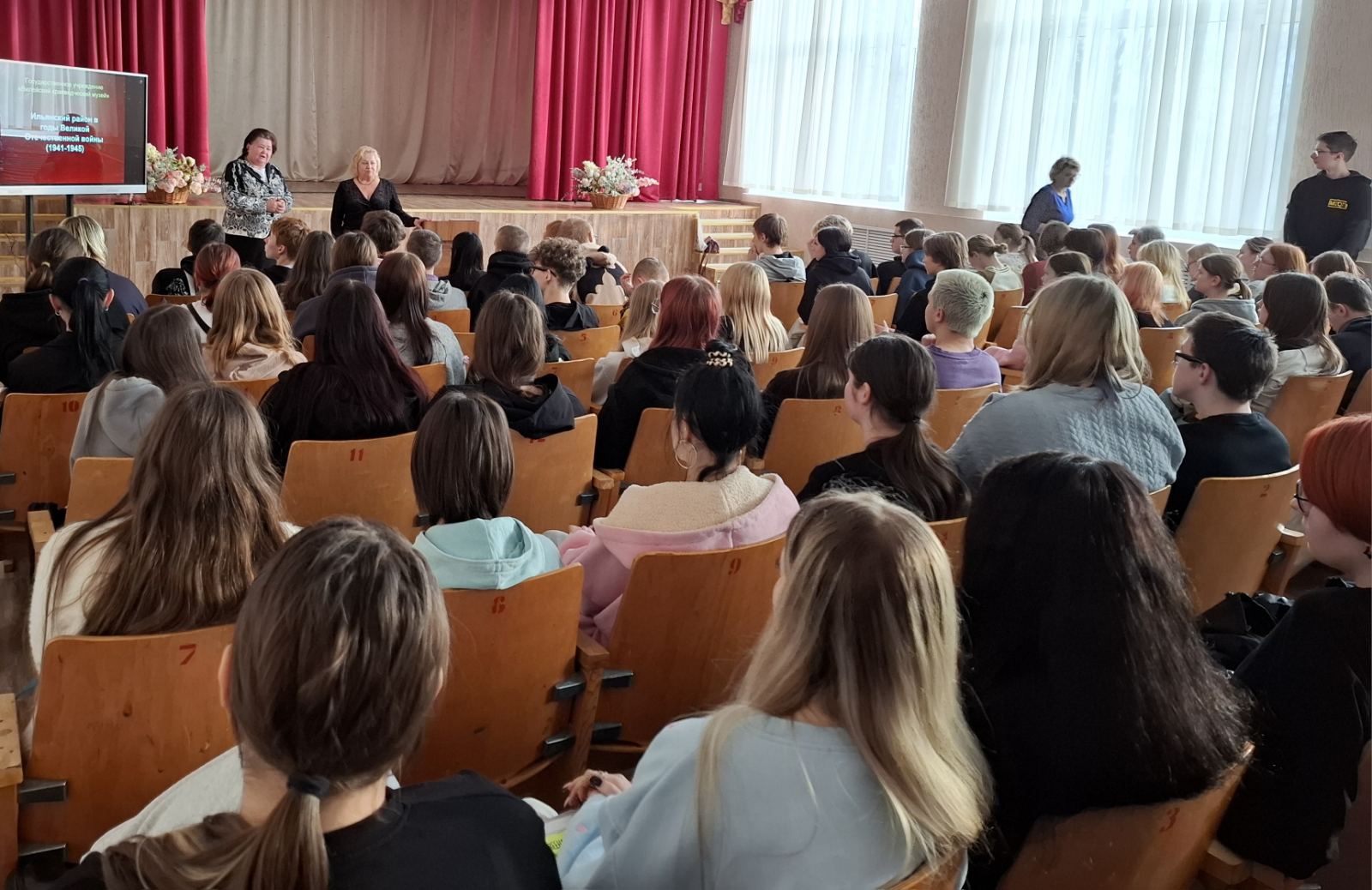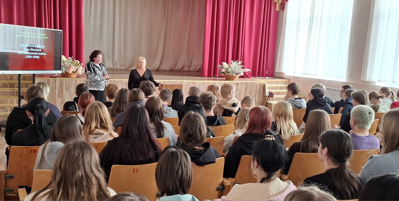 Особое внимание спикер уделила вопросу осуществления геноцида белорусского народа в годы фашистской оккупации в Вилейском районе и на Ильянской земле и героического сопротивления наших земляков немецко-фашистским захватчикам. Молодые люди получили исчерпывающую информацию о подвигах героев Вилейщины, о сопротивлении врагу членов Ильянского комсомольского подполья, о героическом пути партизанской бригады имени Фрунзе, о трагической судьбе узников Ильянского гетто.