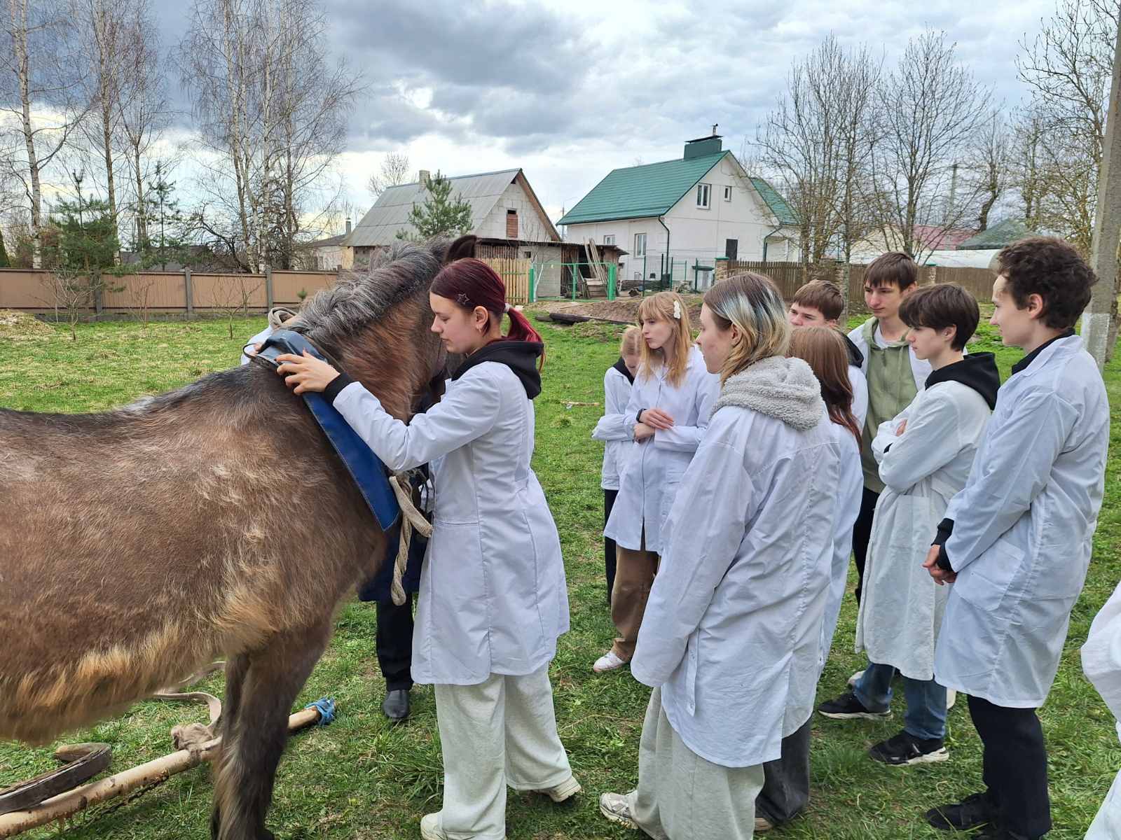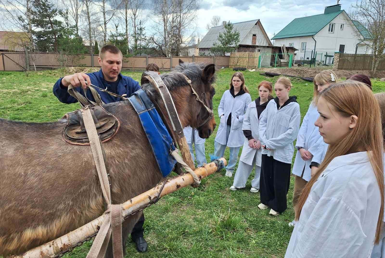 На занятии обучающиеся изучили правила ухода и технику безопасности при работе с лошадьми, ознакомились с элементами одноконной дуговой упряжи. Теоретические знания по запряжке лошади в повозку закрепили практически.