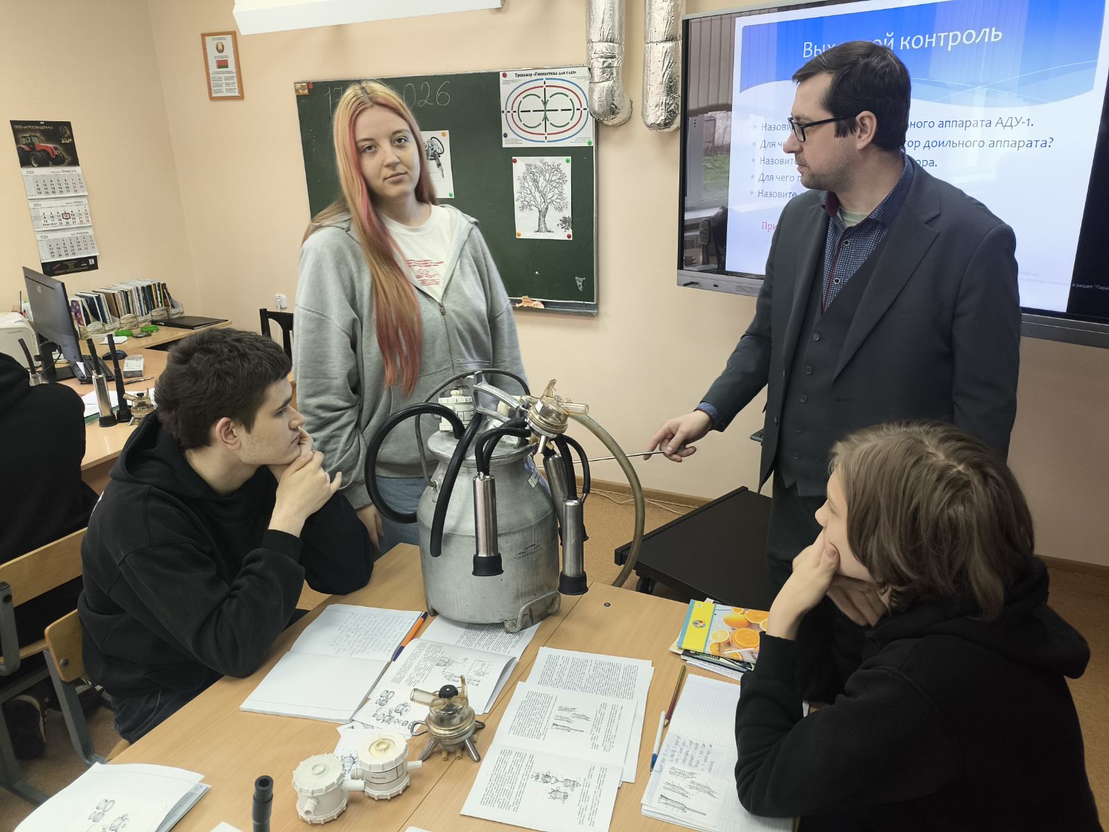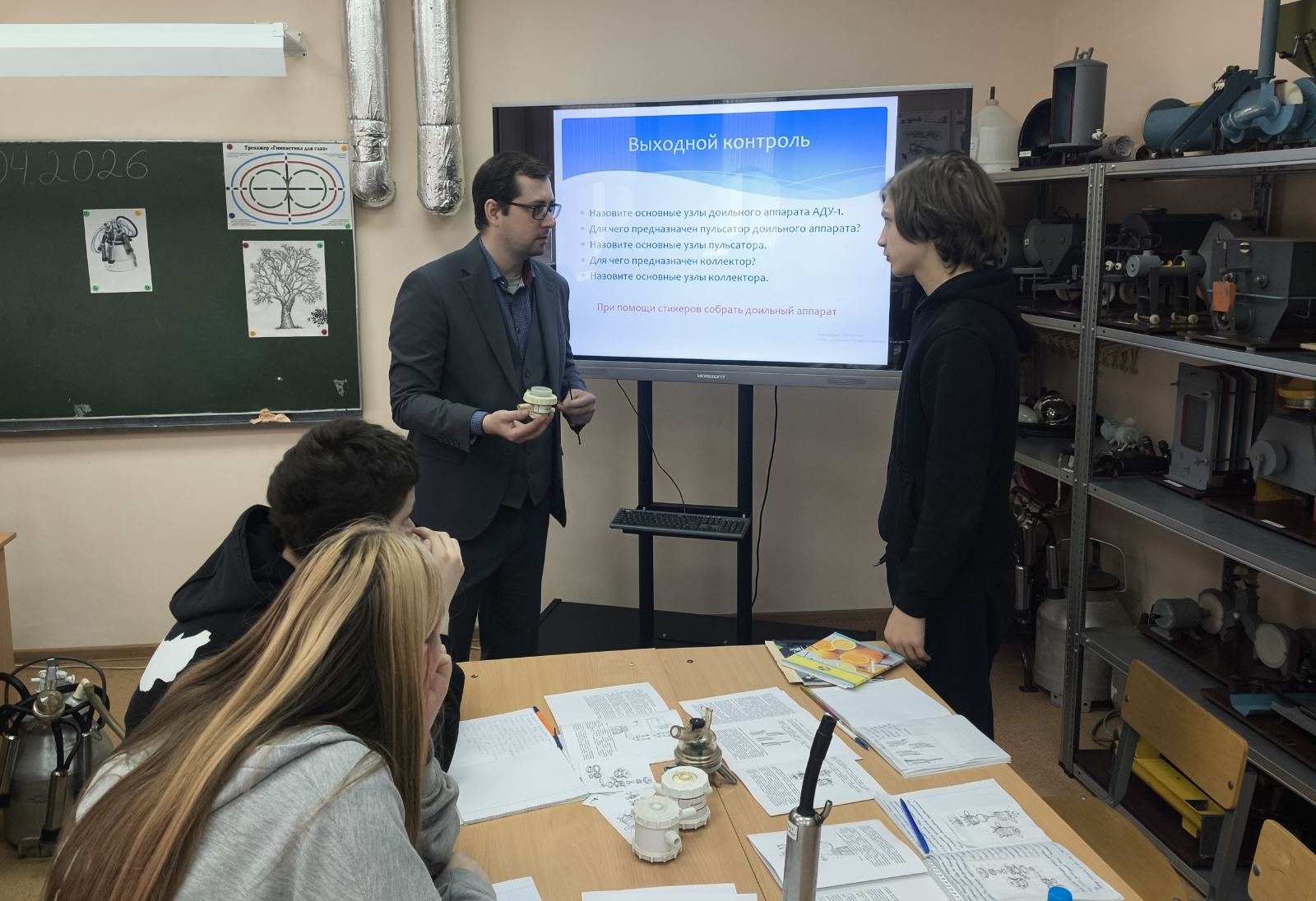 Преподаватель начал занятие с краткого введения в историю и эволюцию доильных аппаратов, подчеркнув значимость автоматизации процессов доения в современных молочных фермах. Он объяснил, как правильно подготовить аппарат к работе, включая проверку всех его компонентов на наличие повреждений и неисправностей. Обучающиеся узнали о принципах работы двухтактного доильного аппарата, который обеспечивает высокую эффективность и производительность, а также минимизирует стресс для животных.