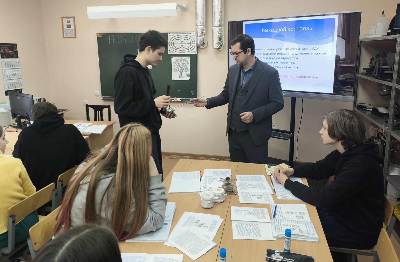 После теоретической части занятия, обучающиеся приступили к практическому этапу — разборке и сборке аппарата. Под руководством Павла Михайловича они изучали каждую деталь доильного аппарата. Преподаватель акцентировал внимание на важности соблюдения техники безопасности и правильного обращения с инструментами. Учащиеся работали в группах, что способствовало обмену опытом и улучшению командной работы.